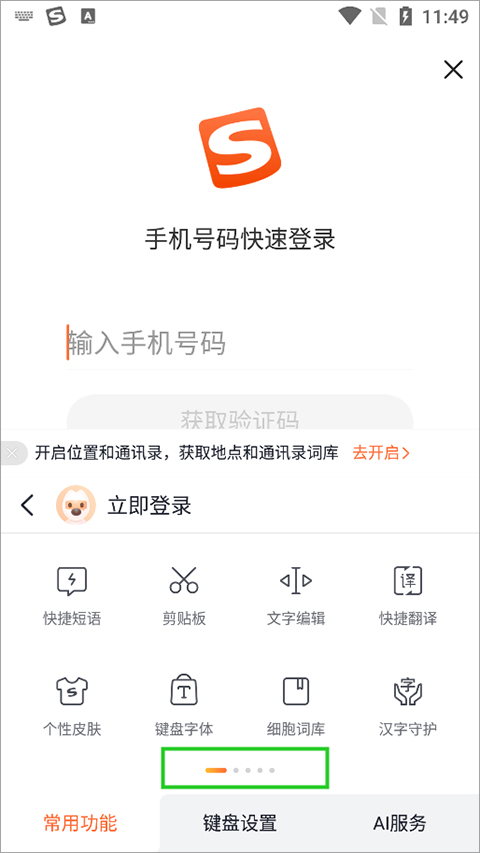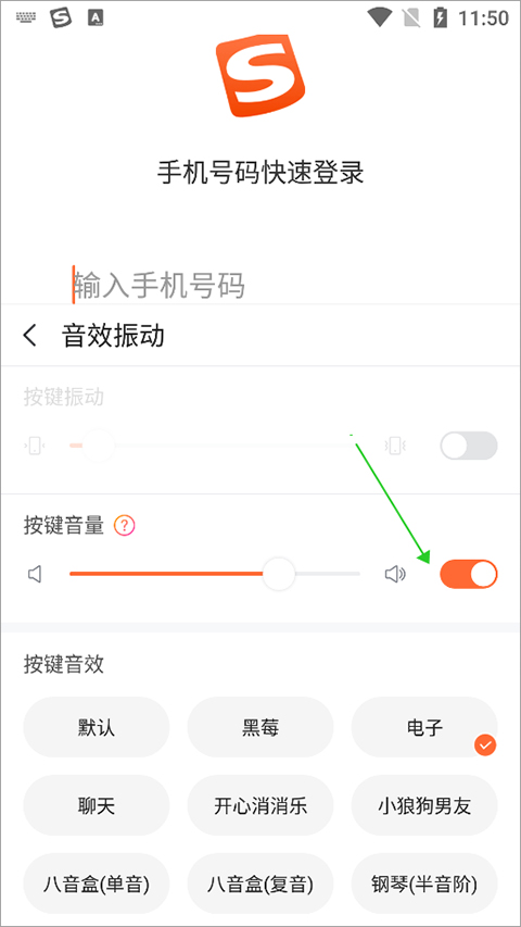 输入法声音该怎么关用户依然是在输入的时候点击如上一个使用教程中第一张图中的logo图标,在切换的新页面中通过向左滑动一次底部导航按钮(下图绿色方框区域)