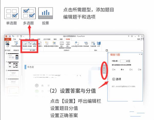 点击所需题型,添加题目(雨课堂目前支持插入单选、多选和投票题)