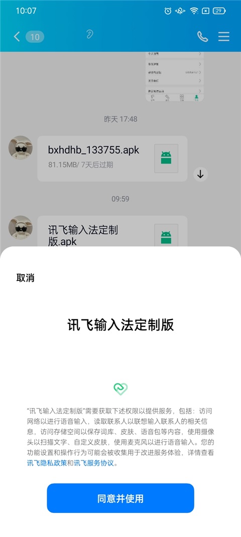 5、前往qq进行聊天,这个时候会显示讯飞输入法,点击同意并使用即可。