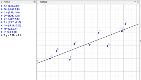 首先,输入数据点的坐标,之后在工具栏选定“最佳拟合直线”选项,在绘图区中框选数据点,即可得到最佳拟合直线,并且在代数区会显示最佳拟合直线的函数表达式。