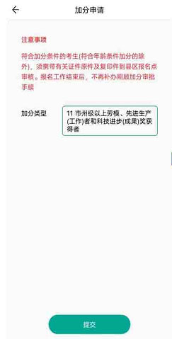 符合加分条件的考生,从首页点击“加分申请”进入加分申请页面,选择加分类型,提交申请,然后携带有关证件原件及复印件到县区报名点审核。