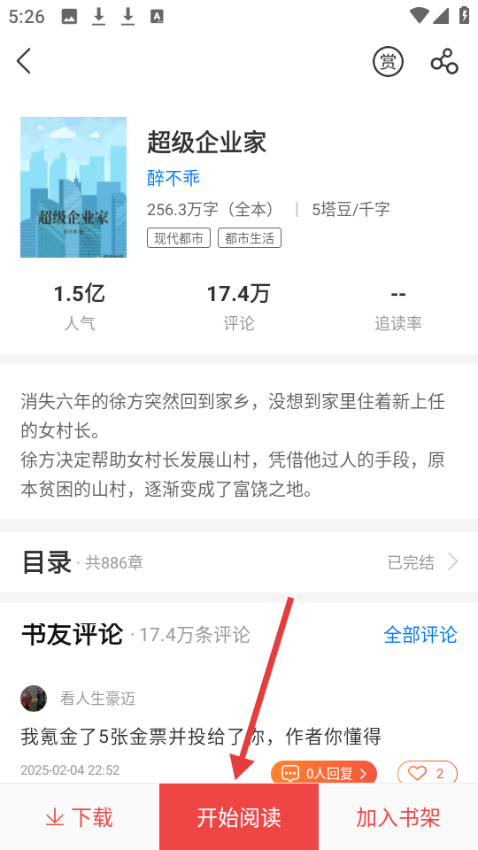 4、于小说详情页面,点击【开始阅读】按钮,即可进入阅读界面。