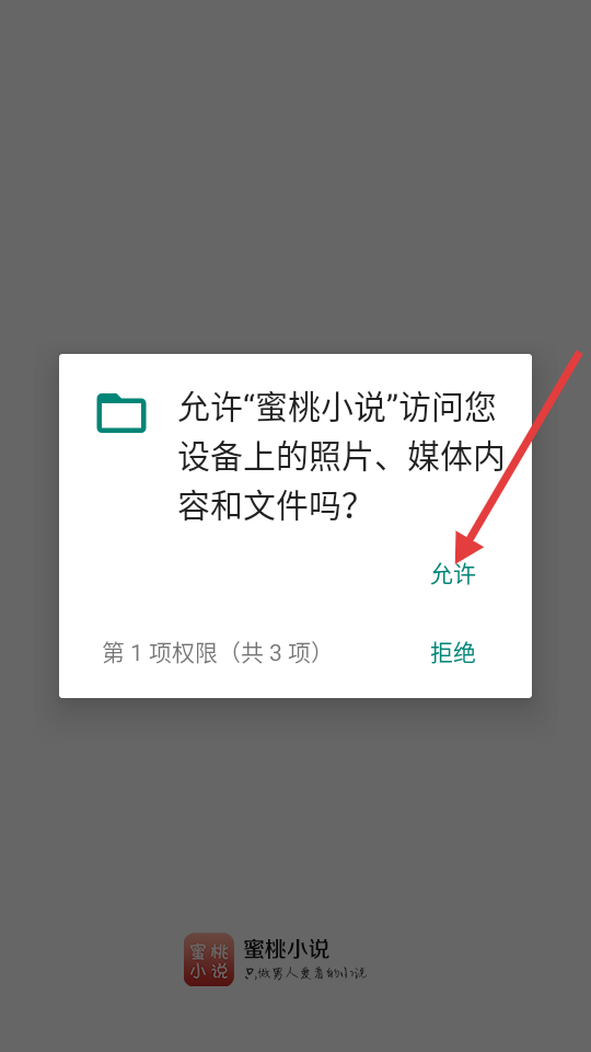 1、当出现“蜜桃小说”的权限请求时,点击【允许】,以此赋予它访问设备照片、媒体内容以及文件的权限。