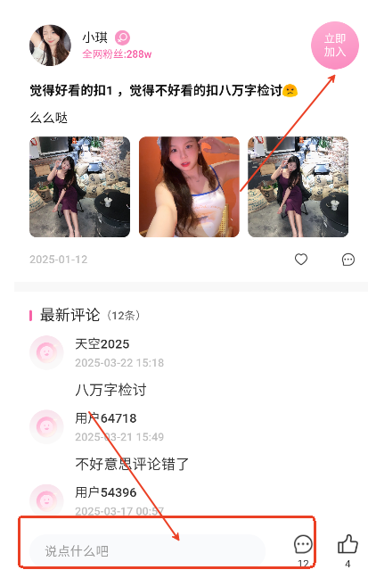 2、进入喜欢的帖子界面,可以下方留言互动,也可以点击右上角立即加入,成为他的粉丝