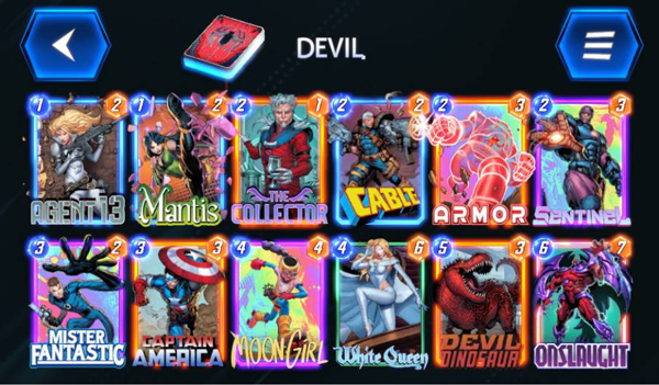 中文卡表: 13号特工、曼蒂斯、收藏家、电索、凯、哨兵、神奇先生、美国队长、月亮女孩、白皇后、恶魔恐龙、狂攻