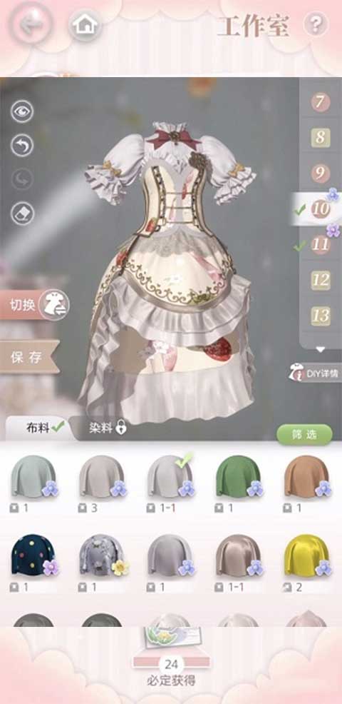 除此之外,游戏中还有更高级的服装制作方法,那就是DIY。不同于以上的固定服装,DIY可以选择更复杂的服装样式,通过更细致的剪裁,展现出更多的细节。