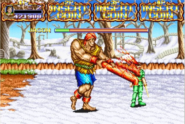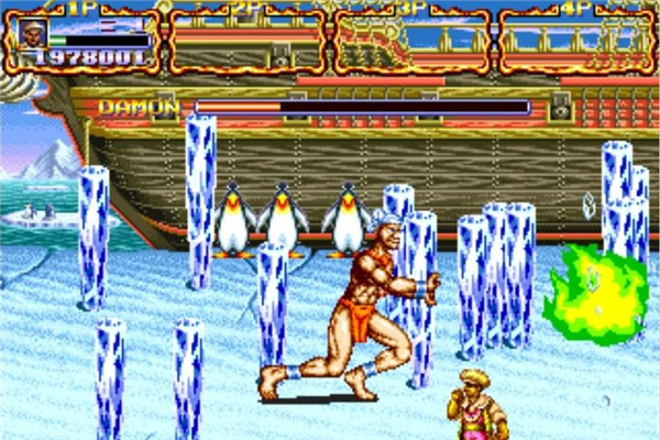 第四关:气功师DAMON,攻击速度快且威力大。腿长,经常用脚踢,会放气功,还会落冰柱。(最后结局:死)